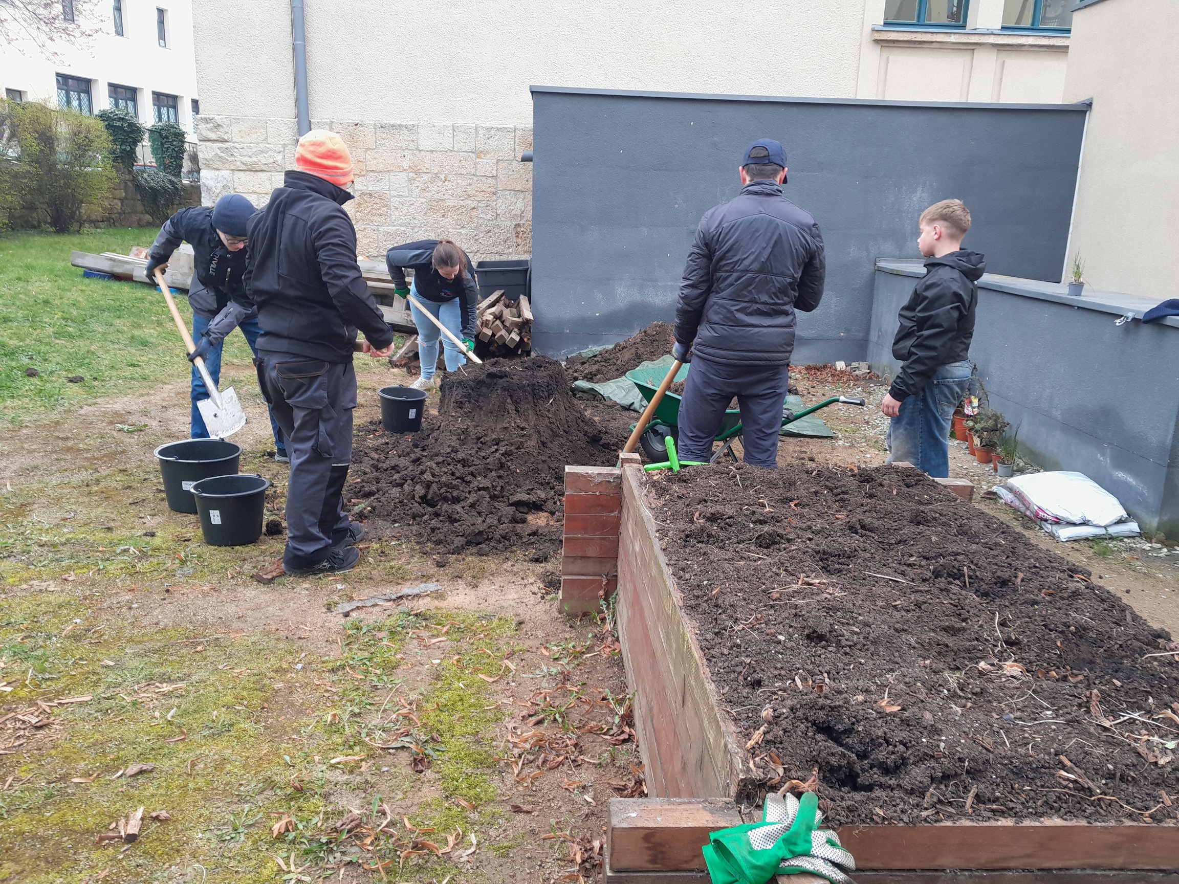 Am Dienstagmorgen, den 24.03. haben wir bei kühlen Außentemperaturen und bedecktem Himmel, mit den Abrissarbeiten der alten Hochbeete begonnen. Unser Hausmeister Herr Bock hat schon erste Arbeiten erledigt, sodass wir unseren Einsatz mit voller Kraft starten konnten. Tatkräftig unterstützt haben uns Jonatan Baum, Tobias Günther, Moritz Helmecke und Silas Pocher aus der 8b, die mit großem Engagement und Körpereinsatz in kurzer Zeit die Beetumrandungen abgebaut haben. Mit Spitzhacke, Schaufeln, Spaten, Schubkarre und Eimern ausgestattet haben wir gemeinsam die gesamte Erde der Beete abgetragen, um Platz für Neues zu schaffen.